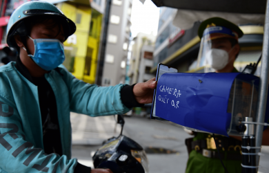 Từ nhiều ngày nay, tại chốt kiết soát ngã sáu Phù Đổng, đầu đường Nguyễn Trãi, quận 1, lực lượng công an phường Bến Thành đã lắp camera quét mã QR để người dân thuận …