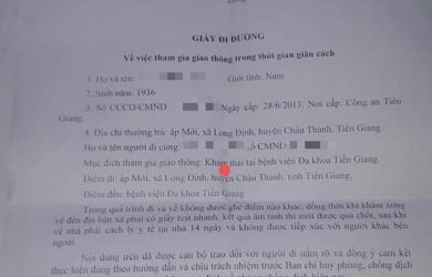 Ông N.V.L. (85 tuổi, ngụ xã Long Định, huyện Châu Thành) và người đi cùng là ông T.T.T. được xã cấp giấy đi đường, trong đó ghi mục đích đi đường là ‘khám t.hai tại …