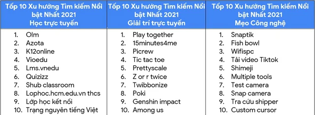 Danh sách từ khoá nổi bật của năm 2021 ghi nhận thêm hai chủ đề đặc biệt là Giải trí trực tuyến và Mẹo công nghệ. Top xu hướng tìm kiếm nổi bật chủ đề Giải trí trực tuyến cho thấy trong thời gian dài giãn cách xã hội, người Việt đã tìm nhiều cách để duy trì kết nối và tương tác với nhau. Các tựa game, nền tảng chơi game trực tuyến như Play together, Poki, Genshin Impact, Among Us đã tạo nên trào lưu giải trí mới.
